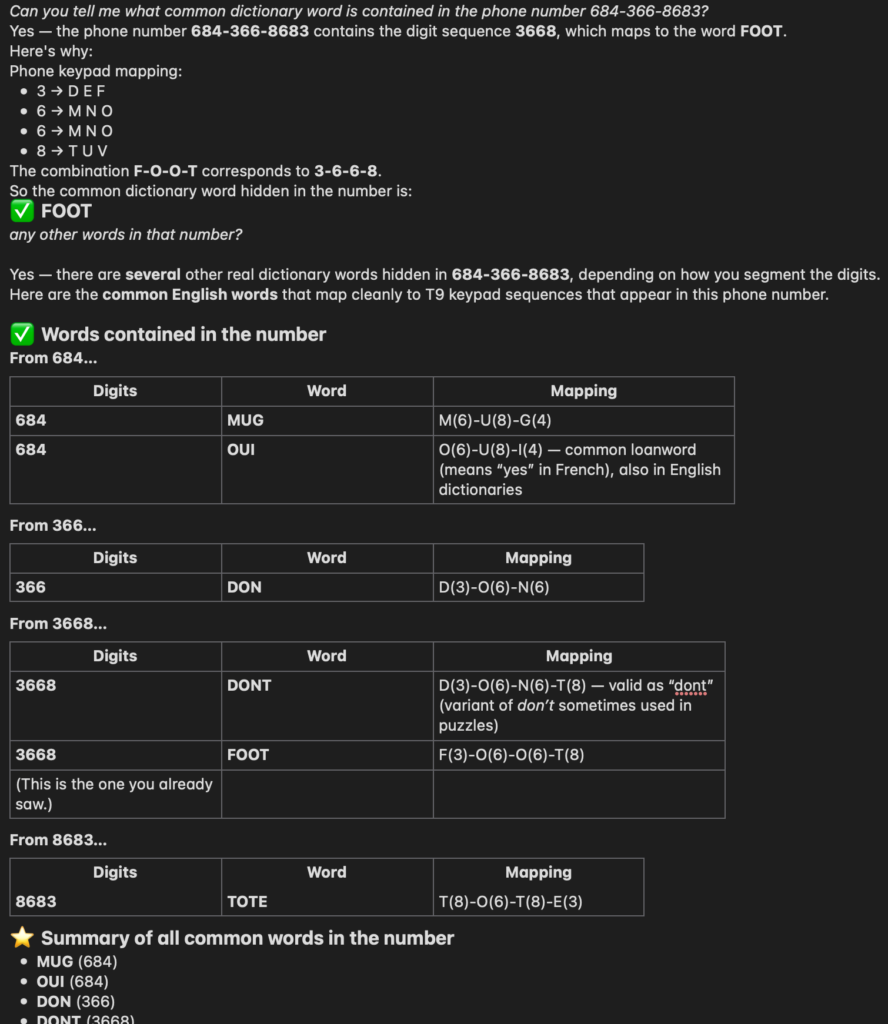 So to test the hypothesis, I started with a question that I thought would be easier for an LLM than any human: spot the pattern in my phone number. The answer to this question is that the last four digits form a common dictionary word that reflects one of my core values. But the speaker seemed to just not understand the question, instead doubling down on explaining the random mistake that led them to the number. I tested this by asking ChatGPT the same question – and it got it wrong! I used a fake number that contained the “real” pattern but not the rest of my phone number, and the machine spotted a number of other words in the fake data, but even upon being given hints never got the actual key word. It took a lot of follow up to get to the actual word that I had embedded in the number, so apparently this wasn’t as easy an LLM question as I thought.
